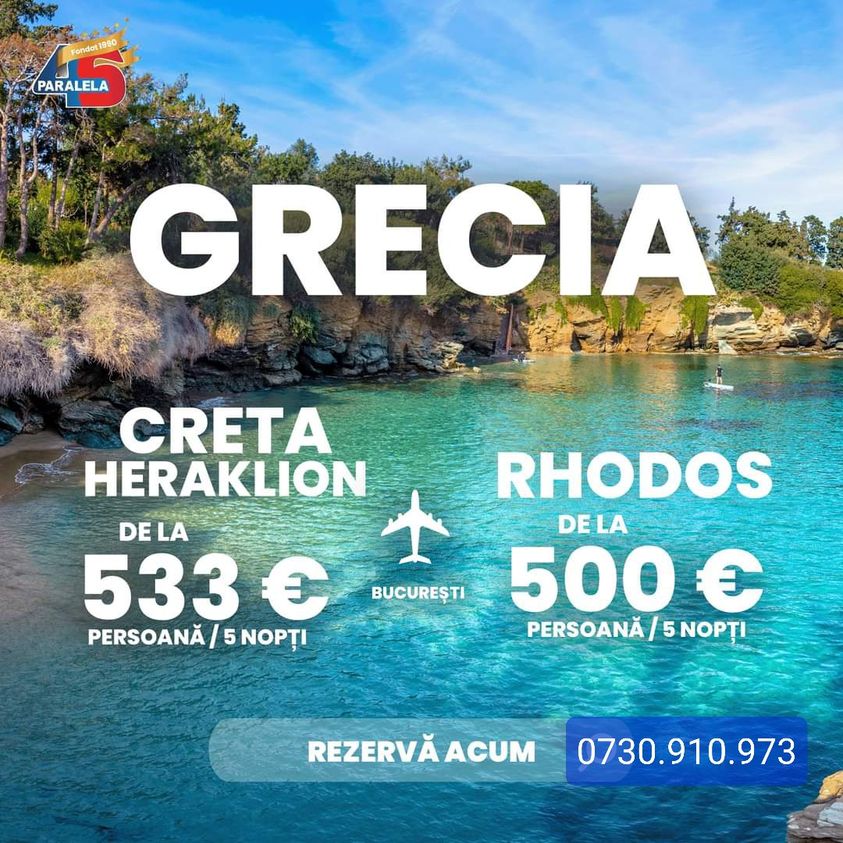 - Charterul de Creta: Explorează, vara aceasta, insula Creta și caută locul favorit pentru tine și cei dragi cu tarife incepand de la 438 eur/pers pentru plecarea din 4.06.2024 la Alexandros Apartments Agia Marina fara masa, biletul de avion si transferul inclus sau Hotel Theo 4* de la 580 eur/pers cu mic dejun, biletul de avion si transferul inclus.