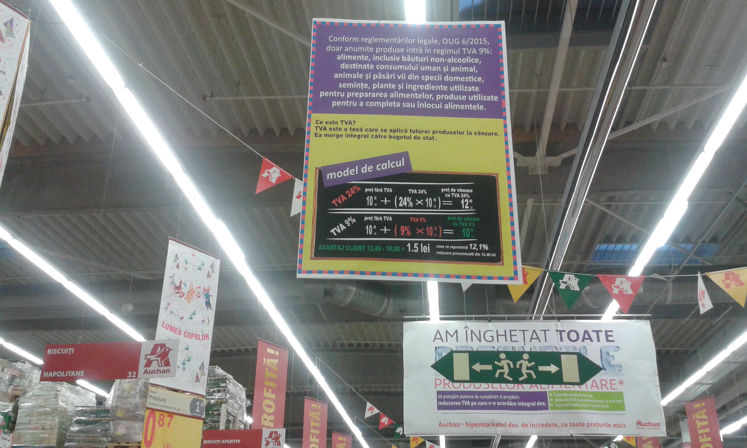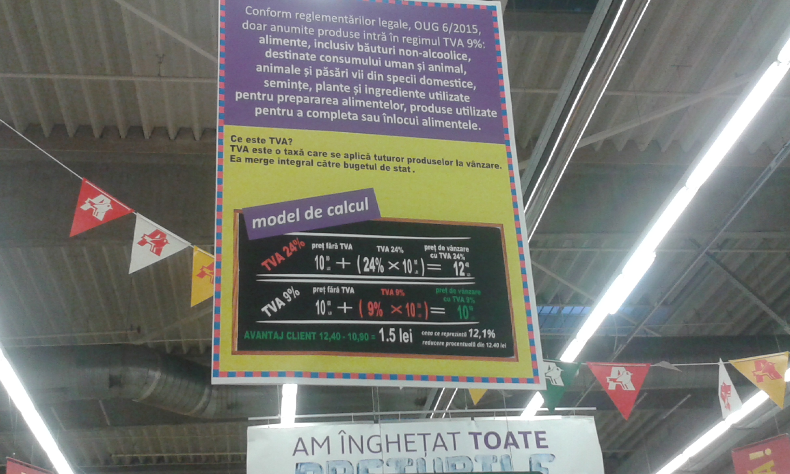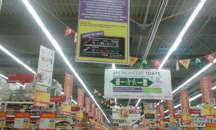 tva calcul hypermarket (3)rgesenii care se aprovizioneaza din marile magazine, hypermarket-uri si chiar supermarket-uri pot observa cu usurinta ca preturile au scazut, pentru ca scaderea se aplica direct la produs si in unele cazuri cetatenii sunt chiar invatati cum se scade TVA-ul la alimente. Pe langa reducerile aplicate pe produs, sunt si pancarte prin care se arata in mod expres cum se face reducerea, dupa noua legislatie privind tax ape valoare adaugata la alimente. Daca vorbim de magazine de panificatie, shaormerii si buticurile de la colt de strada, situatia nu sta atat de bine, pentru ca patronii se eschiveaza si nu respecta legislatia. Mai bine spus, acestia isi baga in buzunar diferenta de bani din scaderea TVA la alimente de la 24 la 9 procente si nu se regaseste in cosul cumparatorului.tva calcul hypermarket (4)