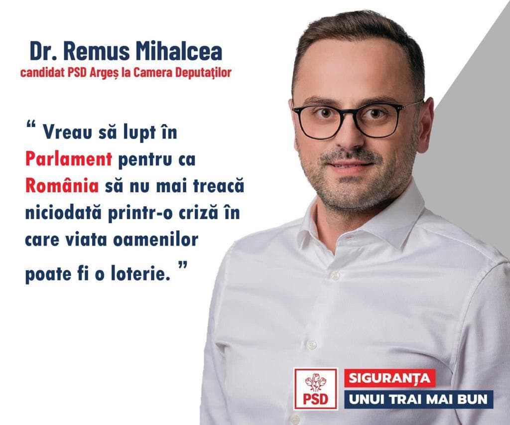 Candidat PSD Argeș pentru Camera Deputaților, dr. Remus Mihalcea, managerul Spitalului Colentina din București, a ajutat de-a lungul carierei mulți argeșeni. Are 35 de ani și a fost medic la Spitalul Județean Argeș, la Spitalul de Pediatrie din Pitești, la Spitalul din Curtea de Argeș și la Colentina acolo unde ocupă și funcția de manager. Remus Mihalcea s-a pus tot timpul în slujba oamenilor. A reușit sa facă performanță acolo unde a activat și declară că și în Parlament nu vrea să facă altceva decât ceea ce a făcut până acum: să schimbe lucrurile în bine.