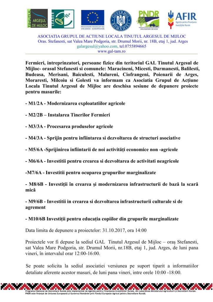 Asociația Grupul de Acțiune Locală Ținutul Argeșul de Mijloc anunță deschisă sesiunea de depunere proiecte pentru măsuri importante în domeniul agricol, cultural, educație și de agrement. Data limită de depunere a proiectelor este 31.10.2017, ora 14.00. Mai multe detalii puteți afla din comunicatul de presă următor: