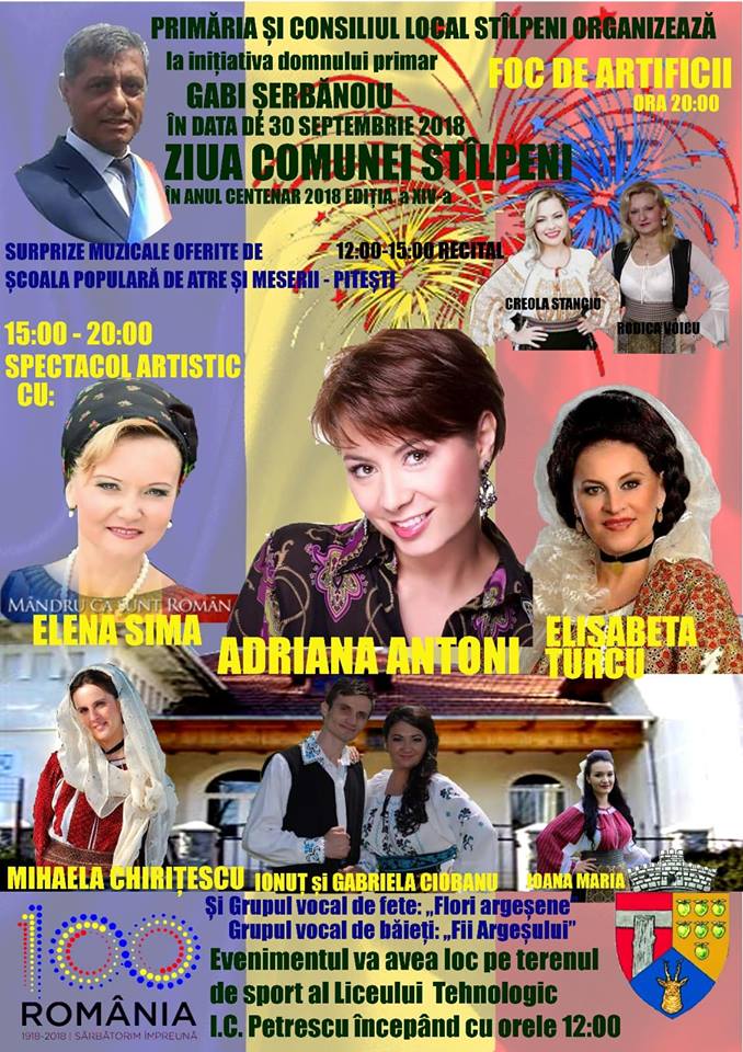 Oaspeți de seamă și surprize muzicale, la Ziua Comunei Stâlpeni, duminică, 30 septembrie. În an Centenar, primarul comunei Stâlpeni, Gabi Șerbănoiu, organizează un eveniment deosebit la cea de-a XIV-a ediție a Zilei Comunei, într-un cadru natural pitoresc. Artistele Elisabeta Turcu și Adriana Antoni sunt invitate speciale pentru a crea o atmosferă cu adevărat de sărbătoare la Stâlpeni.