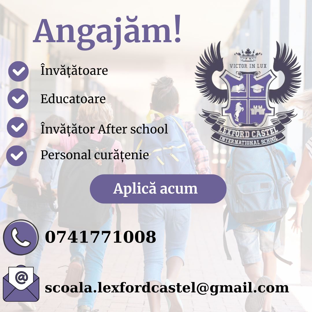 Dacă ești interesată să te alături echipei “Lexford Castel”, poti trimite CV-ul tău actualizat la adresa de email: scoala.lexfordcastel@gmail.com. Detalii suplimentare la numarul de telefon 0741.771008.