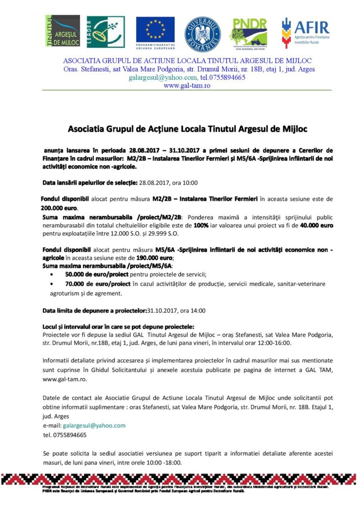 Asociatia Grupul de Acțiune Locala Tinutul Argesul de Mijloc anunța lansarea în perioada 28.08.2017 – 31.10.2017 a primei sesiuni de depunere a Cererilor de Finanțare în cadrul masurilor: M2/2B – Instalarea Tinerilor Fermieri și M5/6A -Sprijinirea infiintarii de noi activități economice non -agricole. Data lansării apelurilor de selecție: 28.08.2017, ora 10:00. Iată comunicatul de presa ce anunță lansarea primei sesiuni de depunere a cererilor de finanțare: