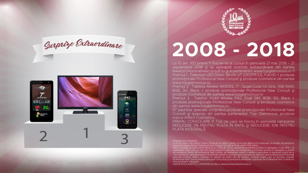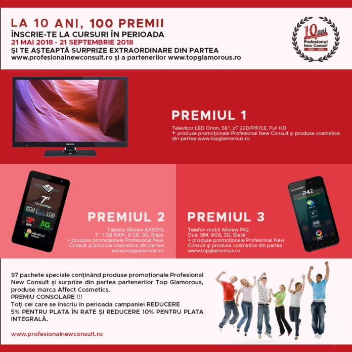 Şi la ceas de sãrbãtoare nimic nu este mai potrivit decât o campanie cu premii consistente intitulatã, 10 ani 100 premii, aşadar, 100 premii vã aşteaptã, dacã vã înscrieţi la cursurile organizate de Profesional New Consult în cadrul centrelor sale, în perioada 21 mai 2018 – 21 septembrie 2018.