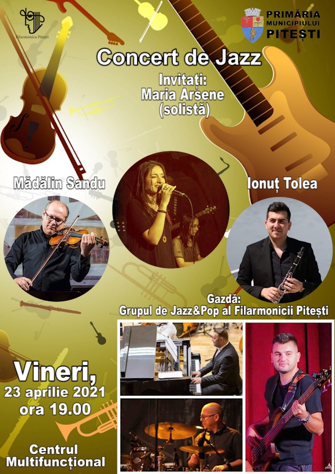 Vineri, 23 aprilie, de la ora 19.00, TrioJazz&Pop Pitești vă invită pe pagina de facebook a Filarmonicii Pitești, www.facebook.com/pitestifilarmonica la un nou concert de jazz. Alături de grupul piteștean al filarmonicii vor evolua, ca soliști, Maria Arsene (voce), Mădălin Sandu (vioară) și Ionuț Tolea (clarinet).