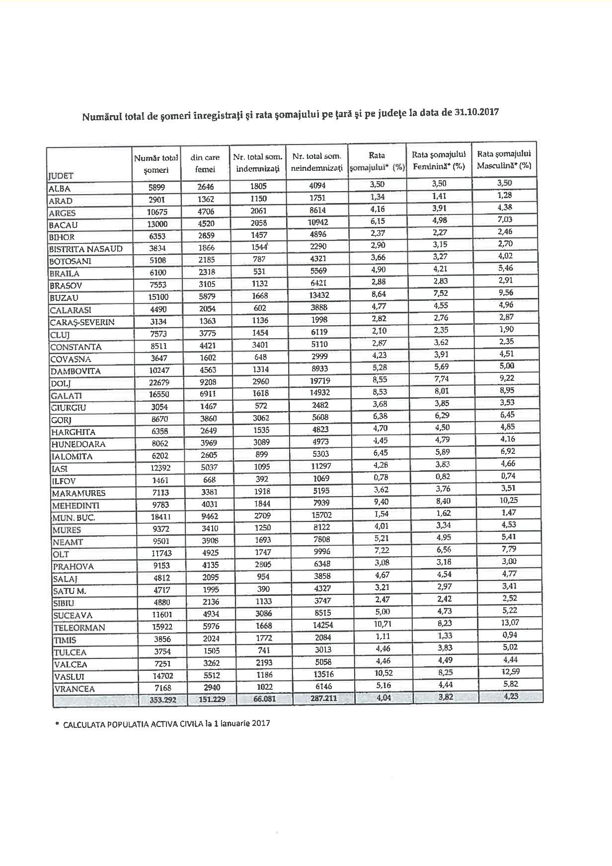 Sunt județe în care această rată a șomajului este mult peste media la nivel național, iar aici putem menționa: Vaslui – 10.52%; Teleorman – 10,71%; Buzău – 8,64%; Galați – 8,53%; Dolj – 8,55%, dar și mult sub media la nivel național în Timiș – 1,11%; Arad – 1,34%; precum și în București – 1,54% ori Ilfov – 0,78%.