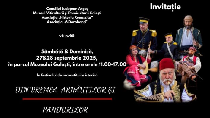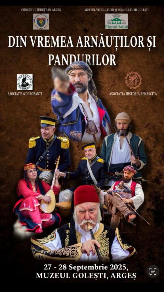 În weekendul 27-28 septembrie, Muzeul Viticulturii și Pomiculturii Golești devine gazda unei incursiuni spectaculoase în trecut. În colaborare cu asociațiile de reconstituire istorică „Historia Renascita” din Pitești și „6 Dorobanți” din București, publicul este invitat să descopere istoria altfel – prin costume autentice, demonstrații militare, ateliere creative și experiențe gastronomice inedite.