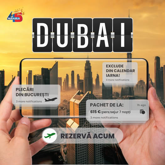 De la plajele de vis, la clădirile iconice și deșertul impresionant, Dubai te așteaptă să te fascineze, iar managerul Agentiei Paralela 45 Turism Pitesti, Florentina Varzescu, ne da si o veste buna: nu mai este o destinatie atat de greu accesibila. “Ofertele sunt din ce in ce mai bune, atat pentru zboruri, cat si pentru cazari, iar cine doreste poate consulta oferta chiar pe site-ul nostru, www.vacanteparalela45.ro. Si pentru ca ne dorim ca visele clientilor nostri sa devina realitate, avem oferte incepand de la 615 euro/persoana pentru un sejur de 7 nopti, cu zboruri din Bucuresti.“, a explicat pentru Ziarulargesenilor.ro Florentina Varzescu, managerul Agentiei Paralela 45 Turism Pitesti.