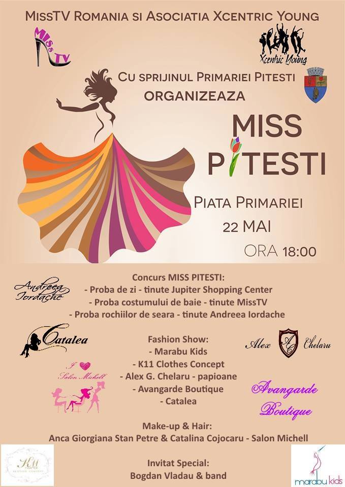 Asociatia Xcentric Young impreuna cu Miss TVsi cu sprijinul Primariei Pitesti va invita vineri, 22 mai, ora 17:30 in Piata Primariei, la prima editie a concursului de frumusete Miss Pitesti. Evenimentul va avea loc in aer liber, in Piata Primariei si face parte din programul oficial al Zilelor orasului Pitesti.