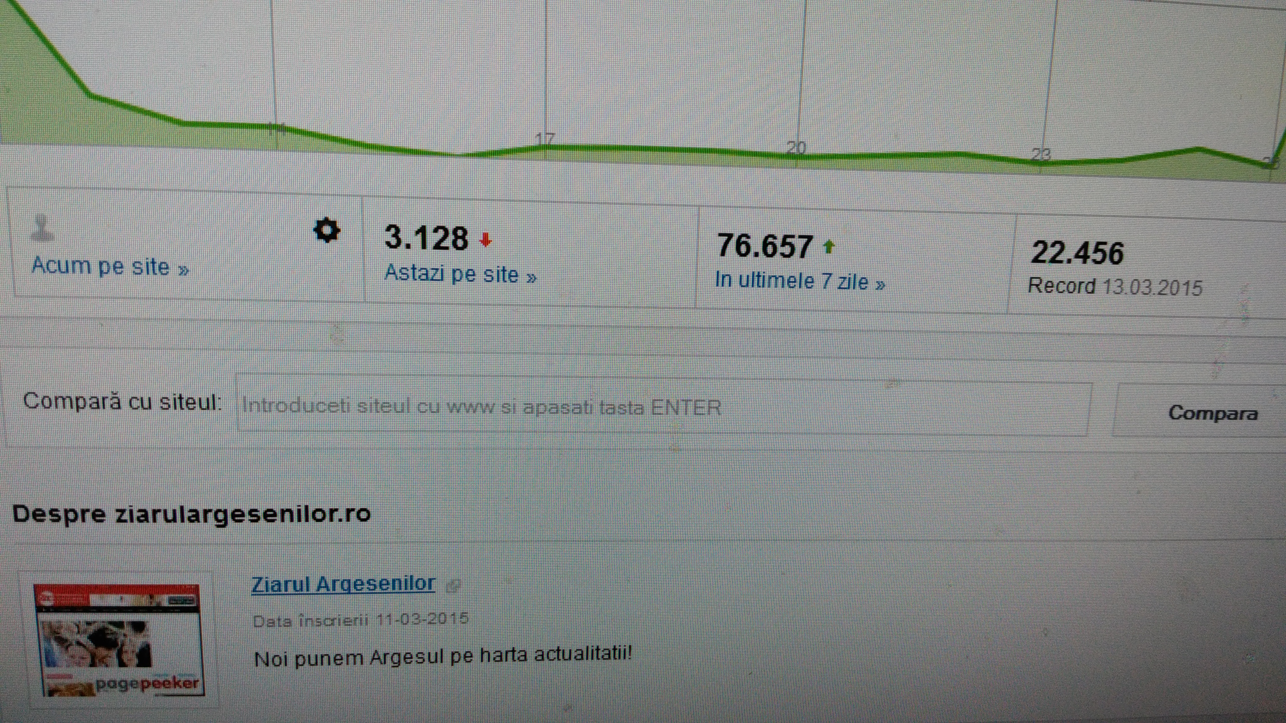 Ziarulargesenilor.ro a inregistrat in ultima perioada, potrivit www.trafic.ro, un numar record de vizitatori unici, cititori care prefera sa se informeze din articolele oferite de jurnalistii ziarului nostru. In ultima saptamana au fost inregistrati circa 77.000 de vizitatori unici (vezi grafic), lucru care ne plaseaza in topul preferintelor argesenilor. Va reamintim ca un numar record al vizitatorilor unici l-am inregistrat pe data de 13 martie 2015, cand 22.456 de cititori au ales sa se informeze din ziarul online www.ziarulargesenilor.ro. Le multumim cititorilor nostri si promitem in continuare acuratete, stiri exacte si corecte!