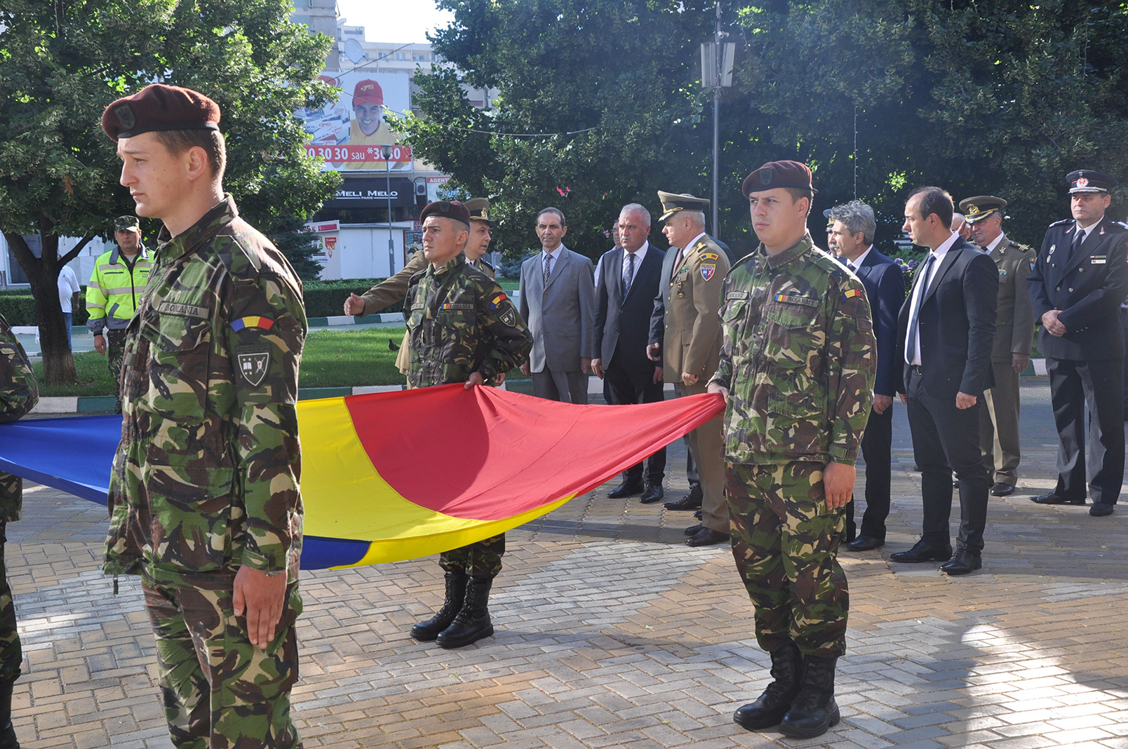 Pe platoul din fața Casei Armatei a avut loc ceremonia publică militară de înălțare a Drapelului României, în cadrul căreia s-a prezentat onorul, a fost intonat imnul național, după care a urmat înălțarea tricolorului pe catarg.